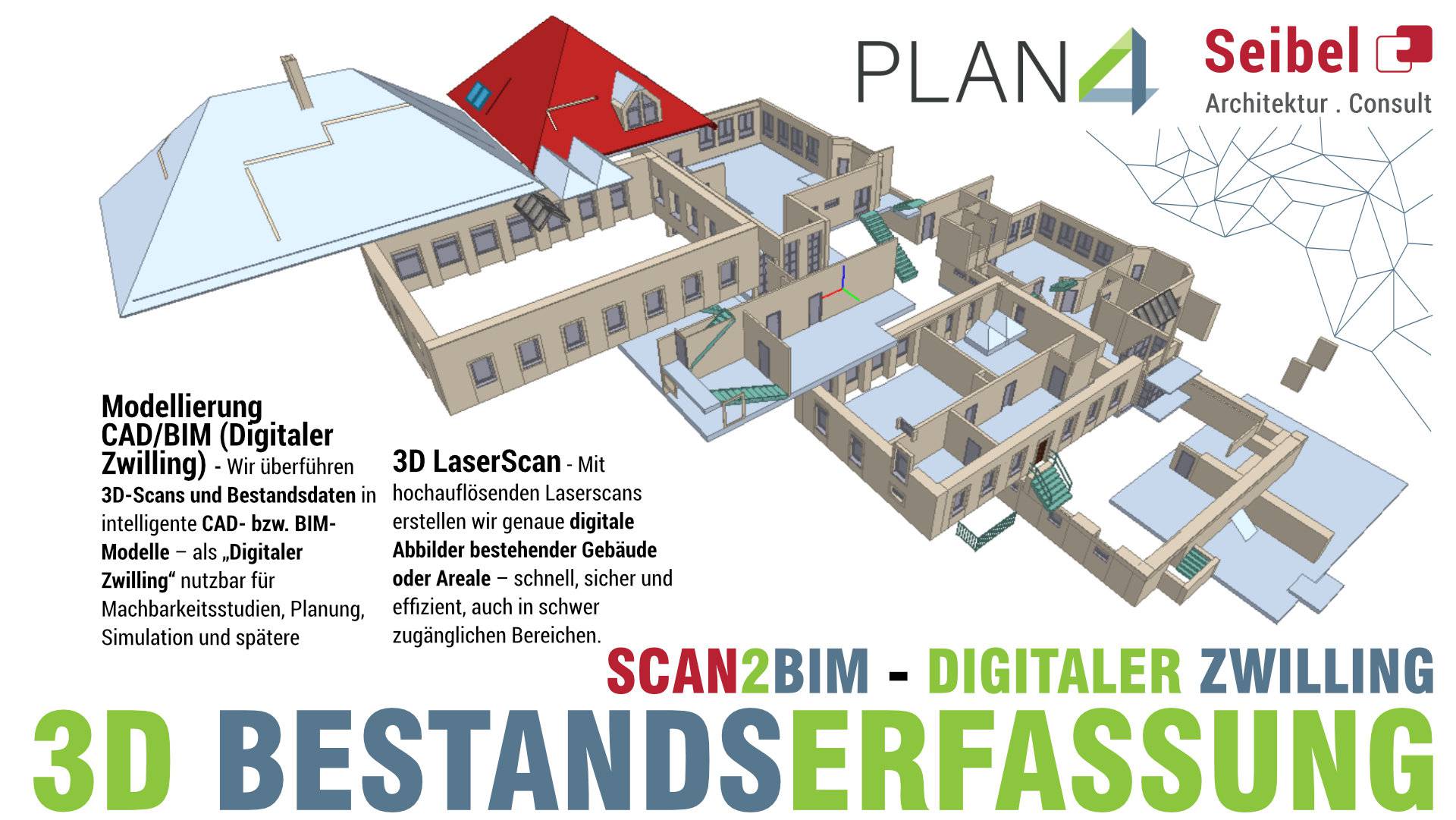 Wir überführen 3D-Scans und Bestandsdaten in intelligente CAD- bzw. BIM-Modelle – als „Digitaler Zwilling“ nutzbar für Machbarkeitsstudien, Planung, Simulation und spätere Bewirtschaftung der Immobilie.