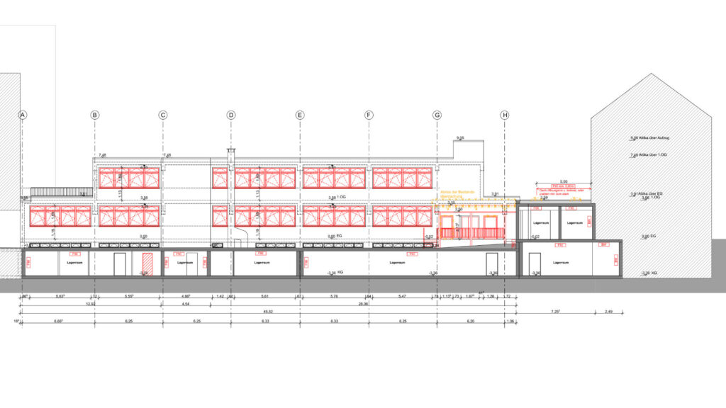 Der Hauptbaukörper hat gem. Baugenehmigung eine rechteckige Grundfläche von etwa 12,00 m x 46,90 m und verfügt über 1 ½ Vollgeschosse, sowie ein Kellergeschoss. Die Fassade ist entsprechend der vorherigen Nutzung funktional gehalten und wurde zwecks optimaler Belichtung der späteren Büros teilweise aufgebrochen und insgesamt aufgefrischt.